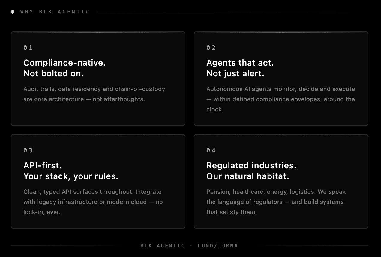 BLK Agentic is a Swedish AI company building reliable, fact-anchored Artificial Intelligence. Our Grounded Intelligence philosophy ensures accuracy and eliminates AI hallucinations. We deliver AI agents, intelligent flow automation, and tailored AI-driven solutions. Our mission is to turn advanced AI into trustworthy, high-impact tools for measurable results.